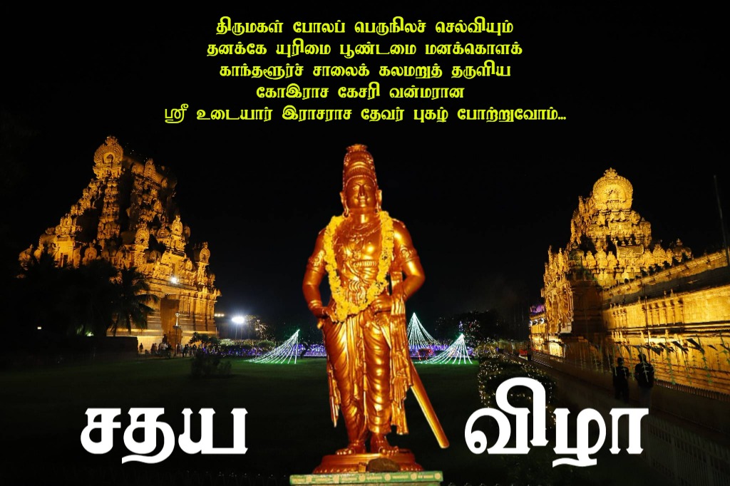 இன்று, ஆயிரம் ஆண்டுகள் கடந்து, உங்கள் திருநட்சத்திரமான ஐப்பசி சதயம் மீண்டும் ஒளிரும் இந்த நன்னாளிலே, உங்களை வெறும் மன்னனாக நான் வாழ்த்த வரவில்லை. ஒரு பண்பாட்டின் சிற்பியாக, ஒரு காலத்தின் காவியத் தலைவனாக, ஒரு நிர்வாகத்தின் பிதாமகனாக உங்களைப் போற்ற வந்திருக்கிறேன்.